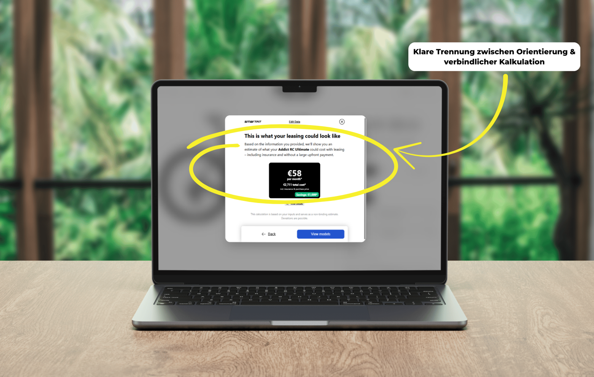 Mit dem Smartfit Leasing-Rechner bietest du deinen Kund:innen im Online-Shop eine einfache und transparente Möglichkeit, die monatlichen Leasingraten direkt beim Fahrradkauf zu berechnen – ohne die Seite zu verlassen. So erleichterst du die Kaufentscheidung, steigerst die Conversion-Rate und machst hochwertige Fahrräder und E-Bikes für eine größere Zielgruppe erschwinglich.