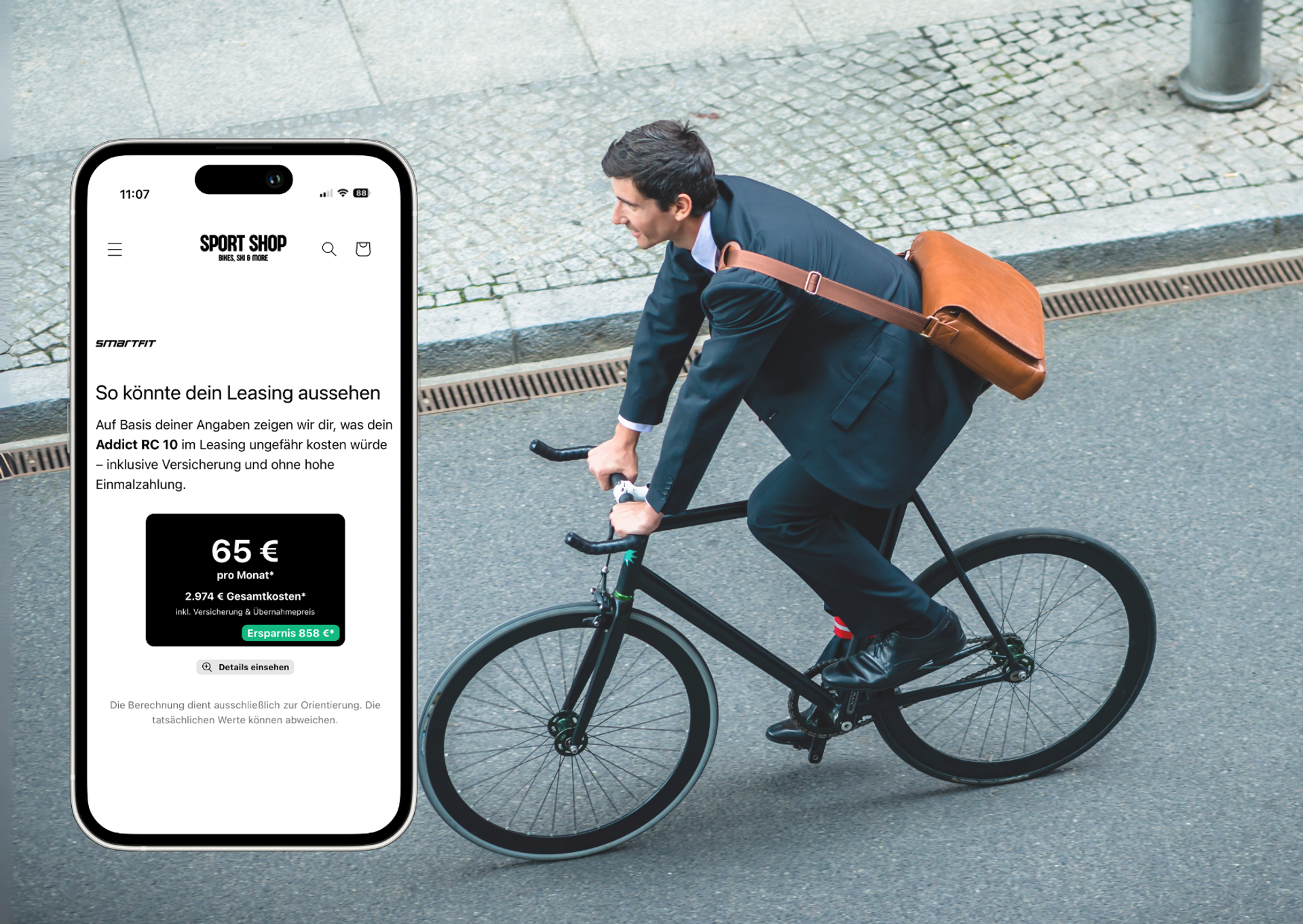 Mit dem Smartfit Leasing-Widget bietest du deinen Kund:innen im Online-Shop eine einfache und transparente Möglichkeit, die monatlichen Leasingraten direkt beim Fahrradkauf zu berechnen – ohne die Seite zu verlassen. So erleichterst du die Kaufentscheidung, steigerst die Conversion-Rate und machst hochwertige Fahrräder und E-Bikes für eine größere Zielgruppe erschwinglich.