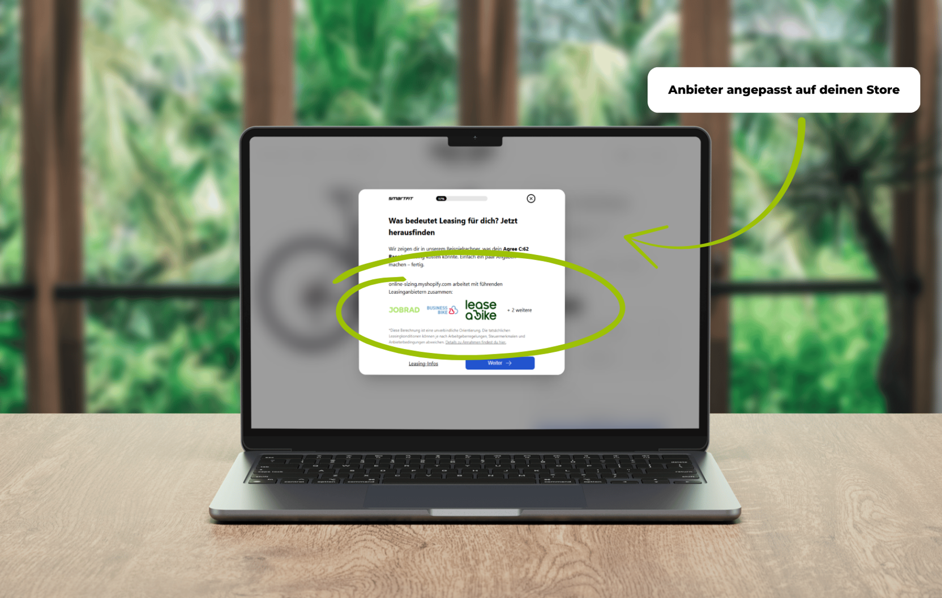 Mit dem Smartfit Leasing-Widget bietest du deinen Kund:innen im Online-Shop eine einfache und transparente Möglichkeit, die monatlichen Leasingraten direkt beim Fahrradkauf zu berechnen – ohne die Seite zu verlassen. So erleichterst du die Kaufentscheidung, steigerst die Conversion-Rate und machst hochwertige Fahrräder und E-Bikes für eine größere Zielgruppe erschwinglich.