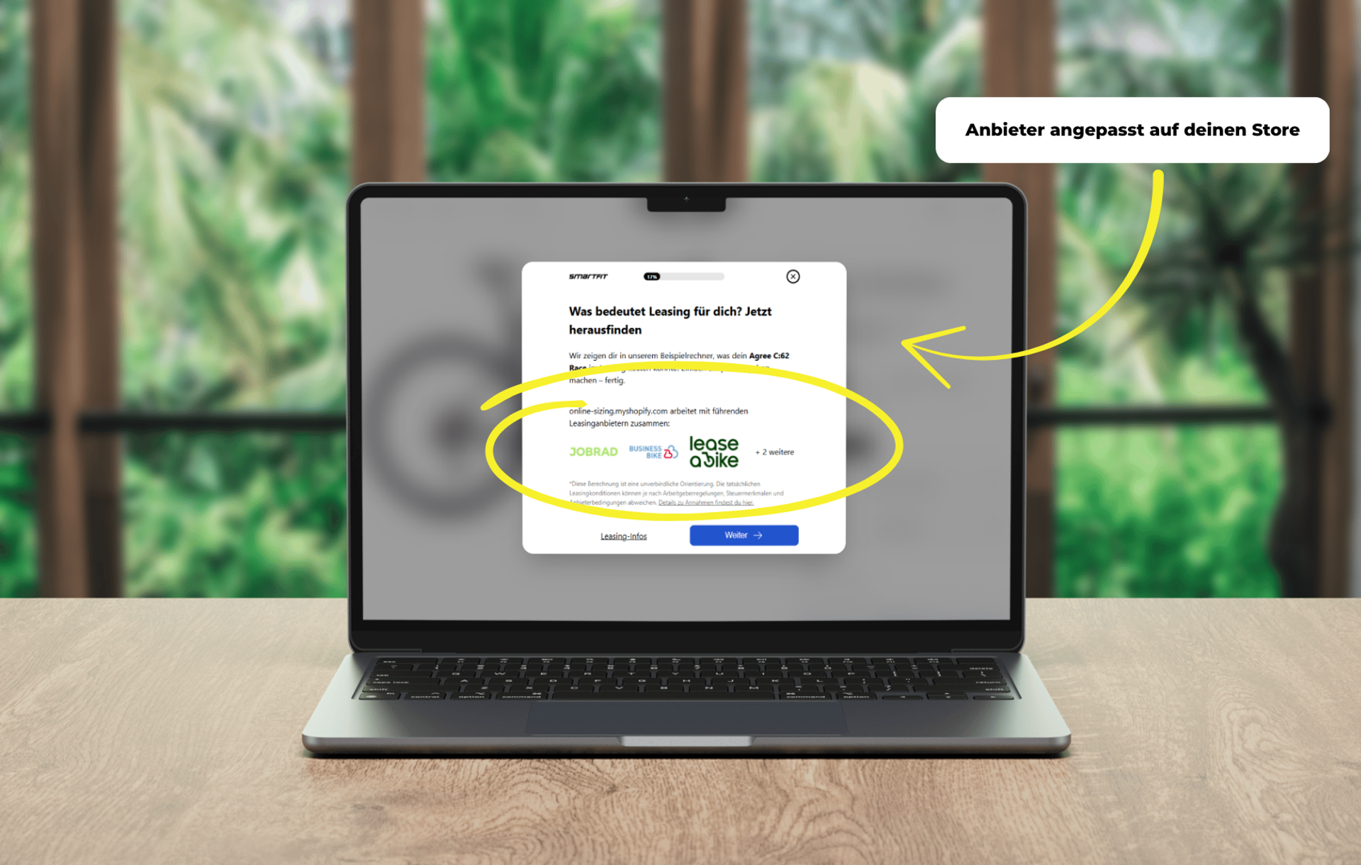 Mit dem Smartfit Leasing-Rechner bietest du deinen Kund:innen im Online-Shop eine einfache und transparente Möglichkeit, die monatlichen Leasingraten direkt beim Fahrradkauf zu berechnen – ohne die Seite zu verlassen. So erleichterst du die Kaufentscheidung, steigerst die Conversion-Rate und machst hochwertige Fahrräder und E-Bikes für eine größere Zielgruppe erschwinglich.