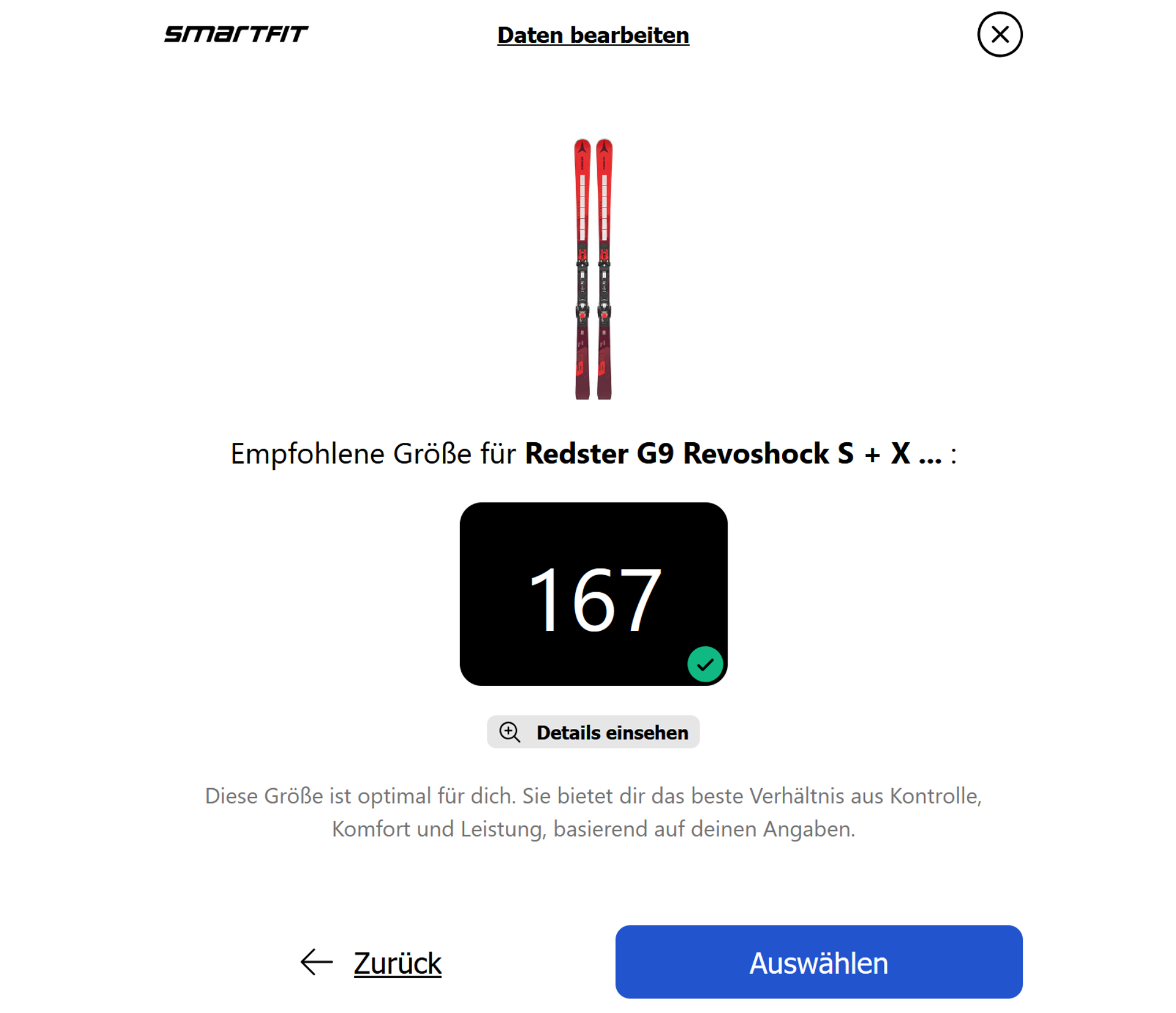 Wenn mehrere Größen in Frage kommen, werden diese übersichtlich dargestellt. Ist eine empfohlene Größe nicht verfügbar, verweist das System automatisch auf sinnvolle Alternativen – angepasst an das Nutzerprofil.