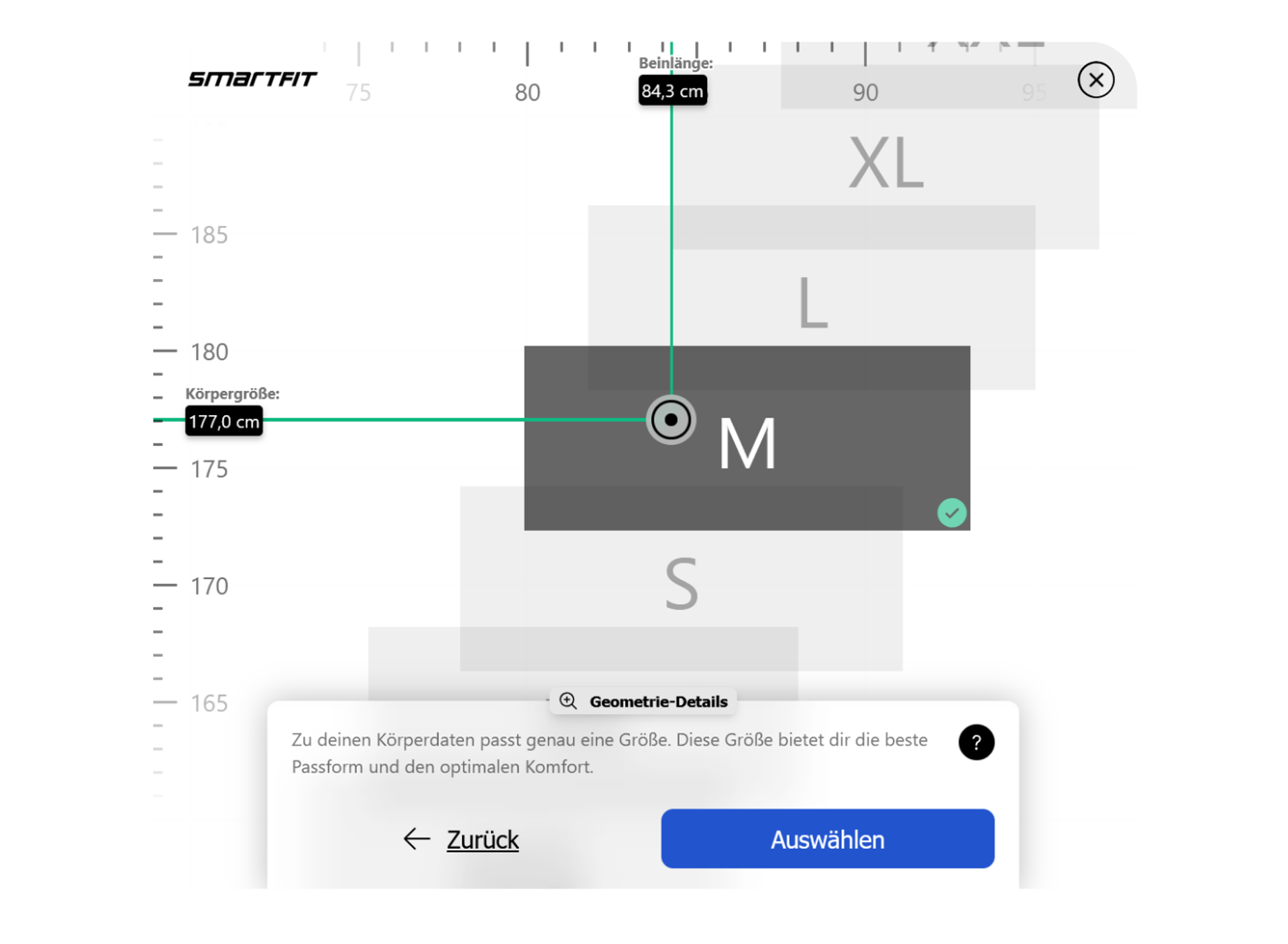 Das Visual Size Chart ergänzt die klassische Größenempfehlung um eine anschauliche grafische Darstellung der Körperdaten im Verhältnis zu den Produktmaßen. Statt nur „Größe M passt dir“ zeigt das Visual Size Chart, warum eine Größe empfohlen wird – z. B. durch die Einordnung von Körpergröße und Innenbeinlänge im Kontext der verfügbaren Rahmengrößen.
