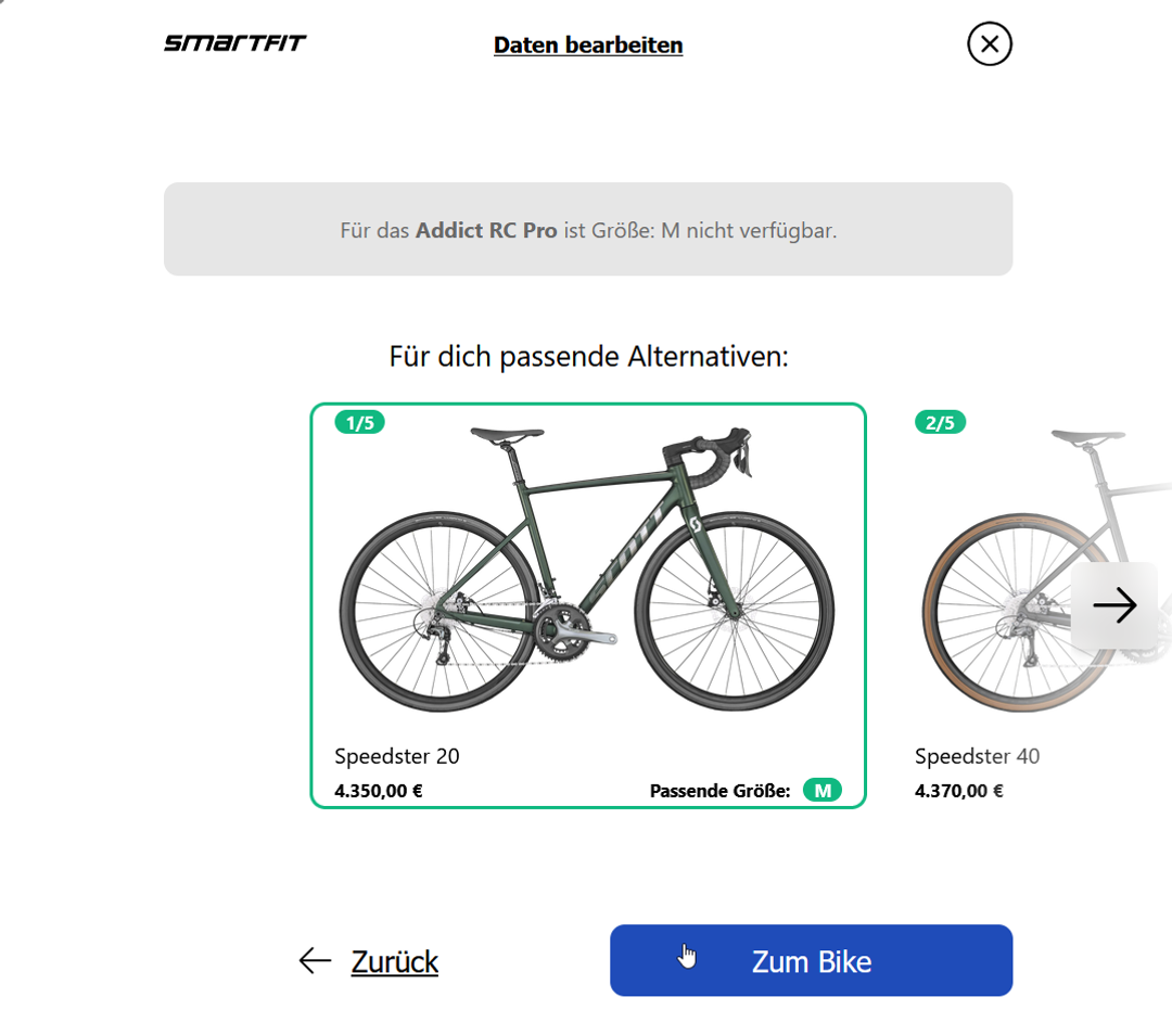 Inhaber / emotion e-Bike Welt WormsDas Smartfit Online-Sizing ist nicht nur ein leicht zu bedienendes, intuitives Tool mit hohem Nutzwert für den User, sondern konnte auch gleichzeitig unseren Kundenservice spürbar entlasten. Nachfragen nach der passenden Rahmengröße und Retouren sind deutlich zurückgegangen, während die direkte Conversion im Shop gestiegen ist.