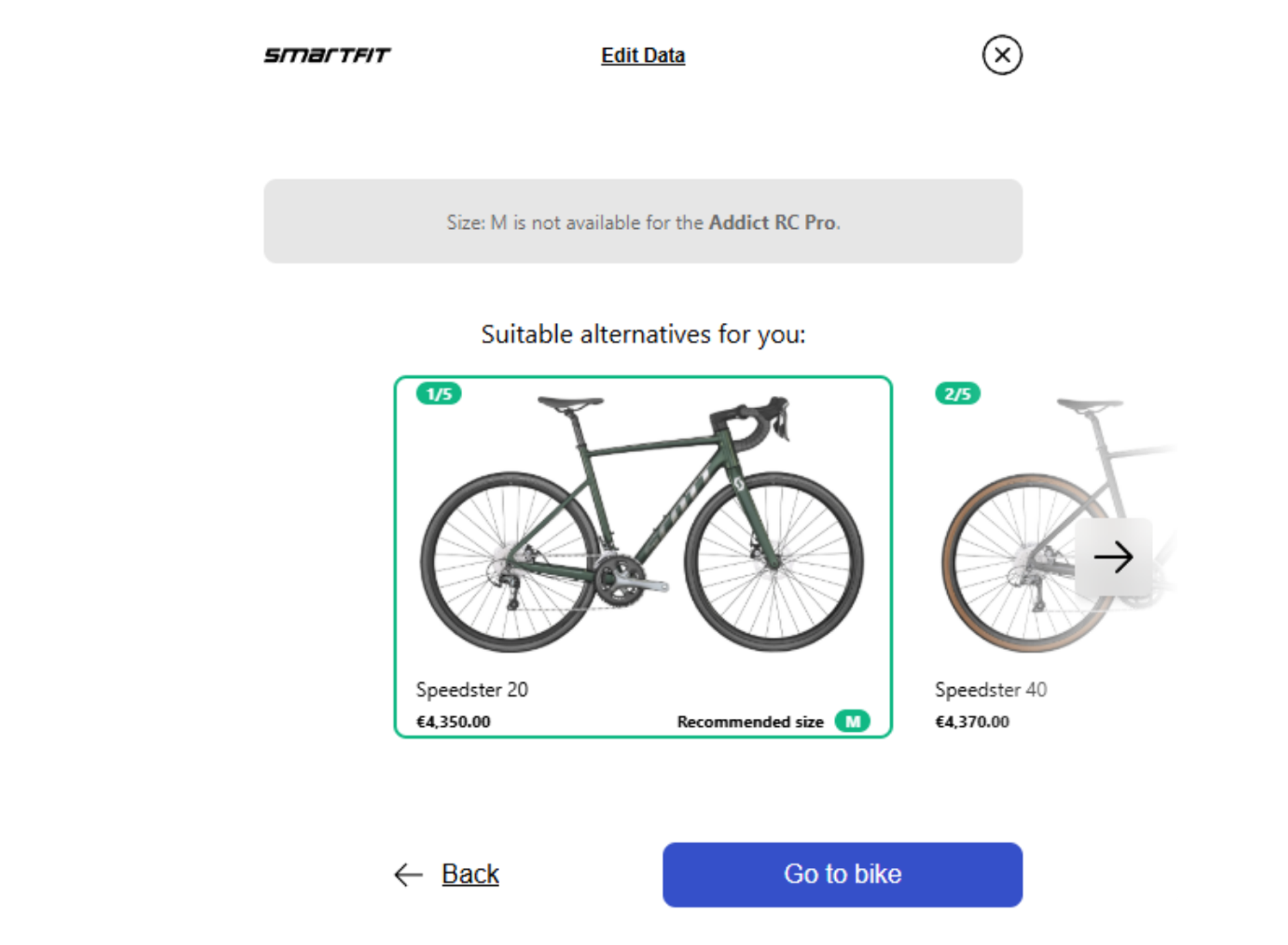 The Recommendation Engine automatically suggests suitable alternatives if a recommended size is unavailable. It uses the results of the previously performed product sizing or category sizing and takes into account both the user's individual body data and current stock availability.