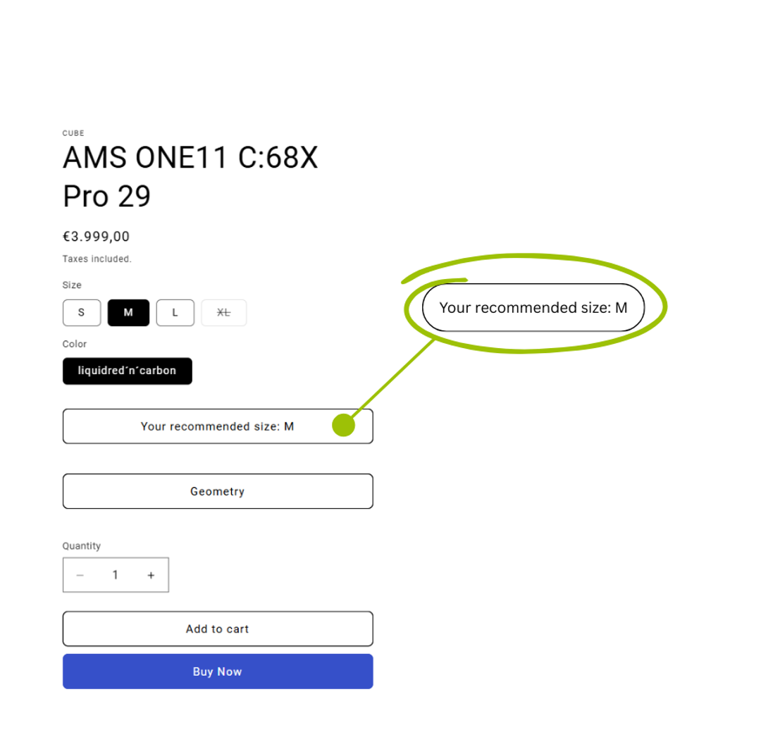 The Smart Sizing Button provides automated, data-driven size recommendations – directly on the product page – without any additional clicks. As soon as relevant customer data (e.g., height, inside leg length, gender) is available, the button displays the individually appropriate size.