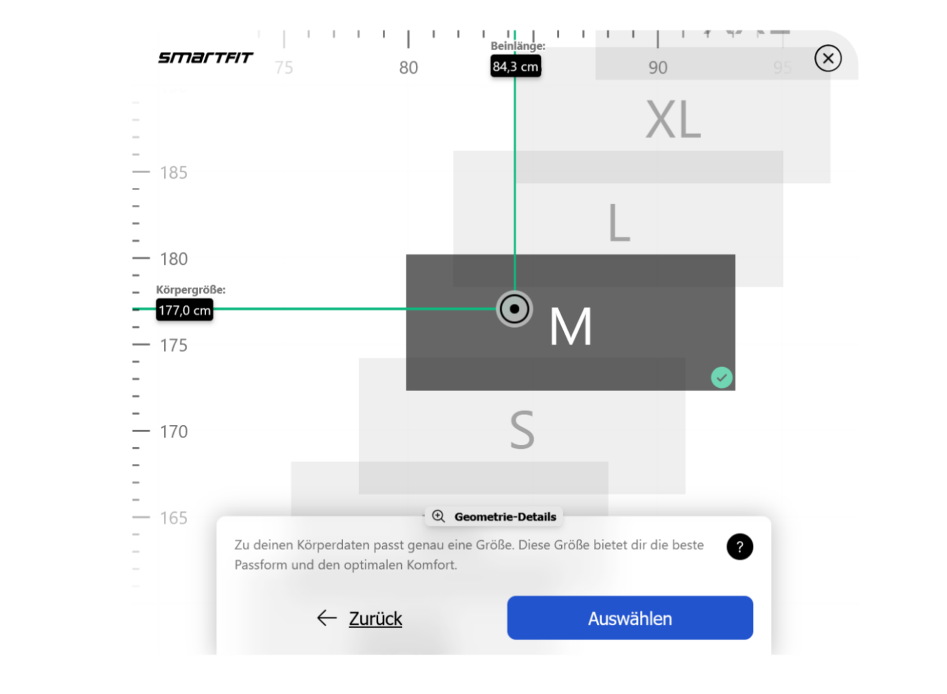 The Visual Size Chart complements the classic size recommendation with a clear graphical representation of body measurements in relation to product measurements. Instead of simply stating "Size M fits you," the Visual Size Chart shows why a size is recommended – for example, by classifying body height and inseam length in the context of available frame sizes.